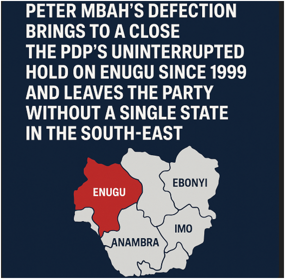 The defection brings to a close the PDP’s uninterrupted hold on Enugu since 1999 and leaves the party without a single state in the South-East.